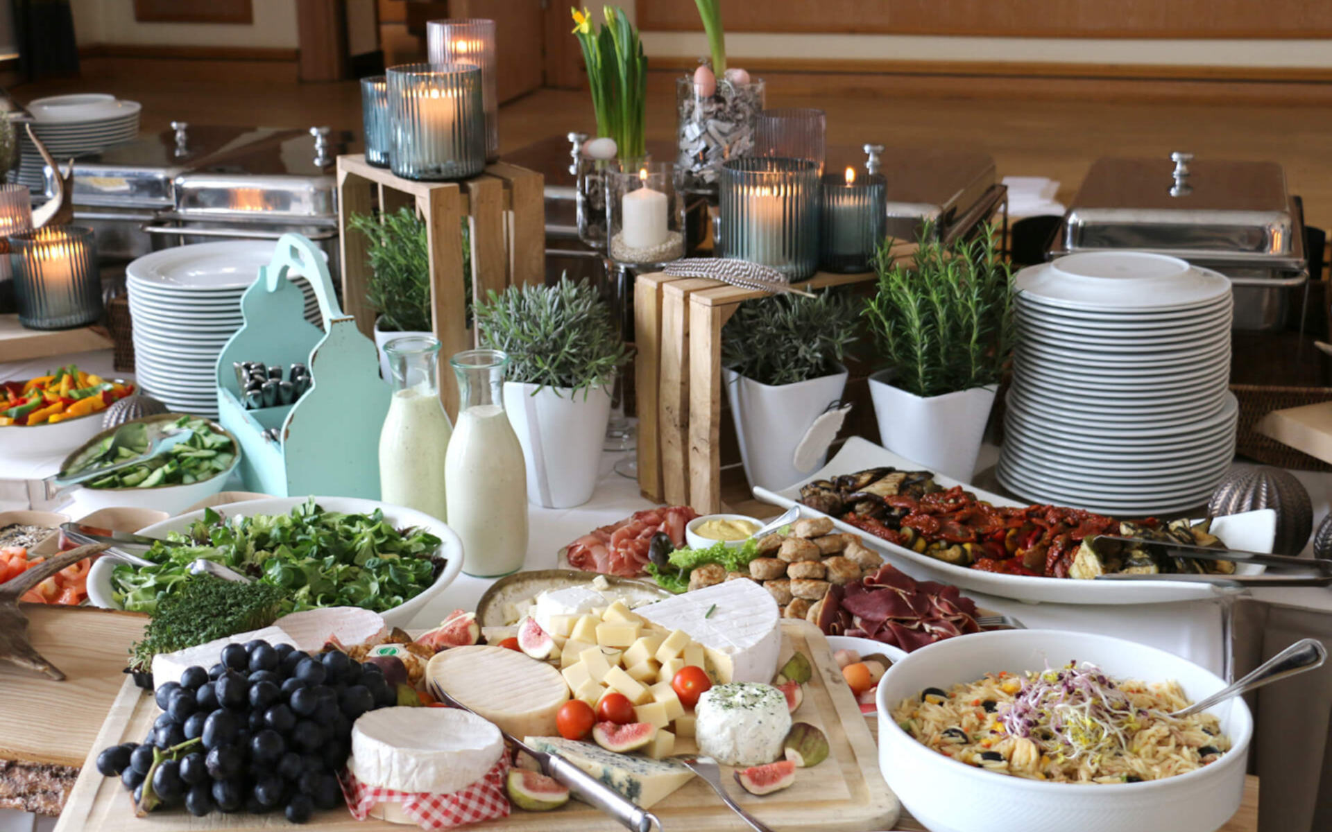 Süße und herzhafte Frühstücksvariationen, große Auswahl an Hauptgerichten, raffinierte Desserts, alkoholische und alkoholfreie Getränke, Kaffeespezialitäten.