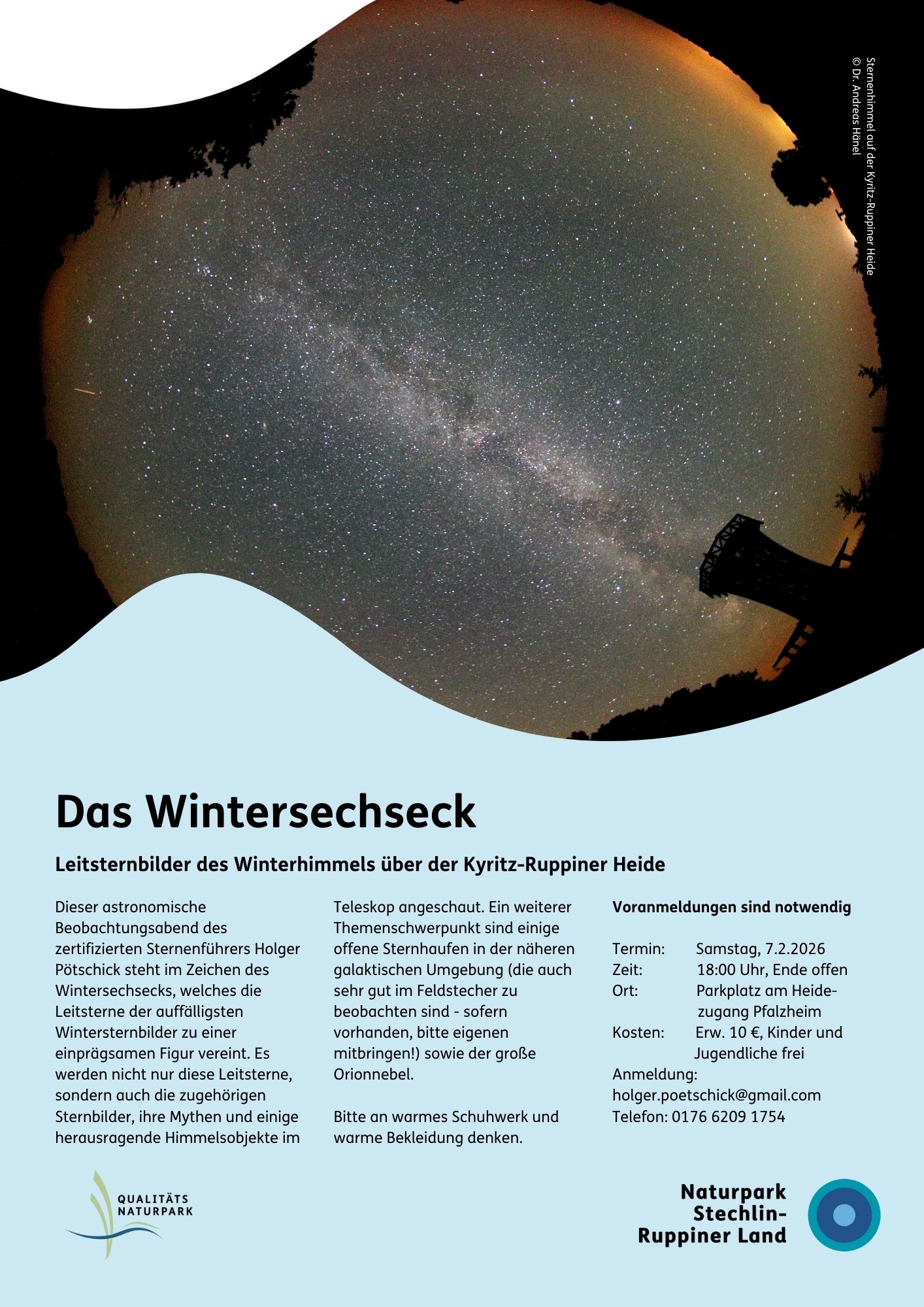 Dieser astronomische Beobachtungsabend des zertifizierten Sternenführers Holger Pötschick steht im Zeichen des Wintersechsecks, welches die Leitsterne der auffälligsten Wintersternbilder zu einer einprägsamen Figur vereint. Es werden nicht nur diese Leitsterne, sondern auch die zugehörigen Sternbilder, ihre Mythen und einige herausragende Himmelsobjekte im Teleskop angeschaut. Ein weiterer Themenschwerpunkt sind einige offene Sternhaufen in der näheren galaktischen Umgebung (die auch sehr gut im Feldstecher zu beobachten sind – sofern vorhanden, bitte eigenen mitbringen!) sowie der große Orionnebel.