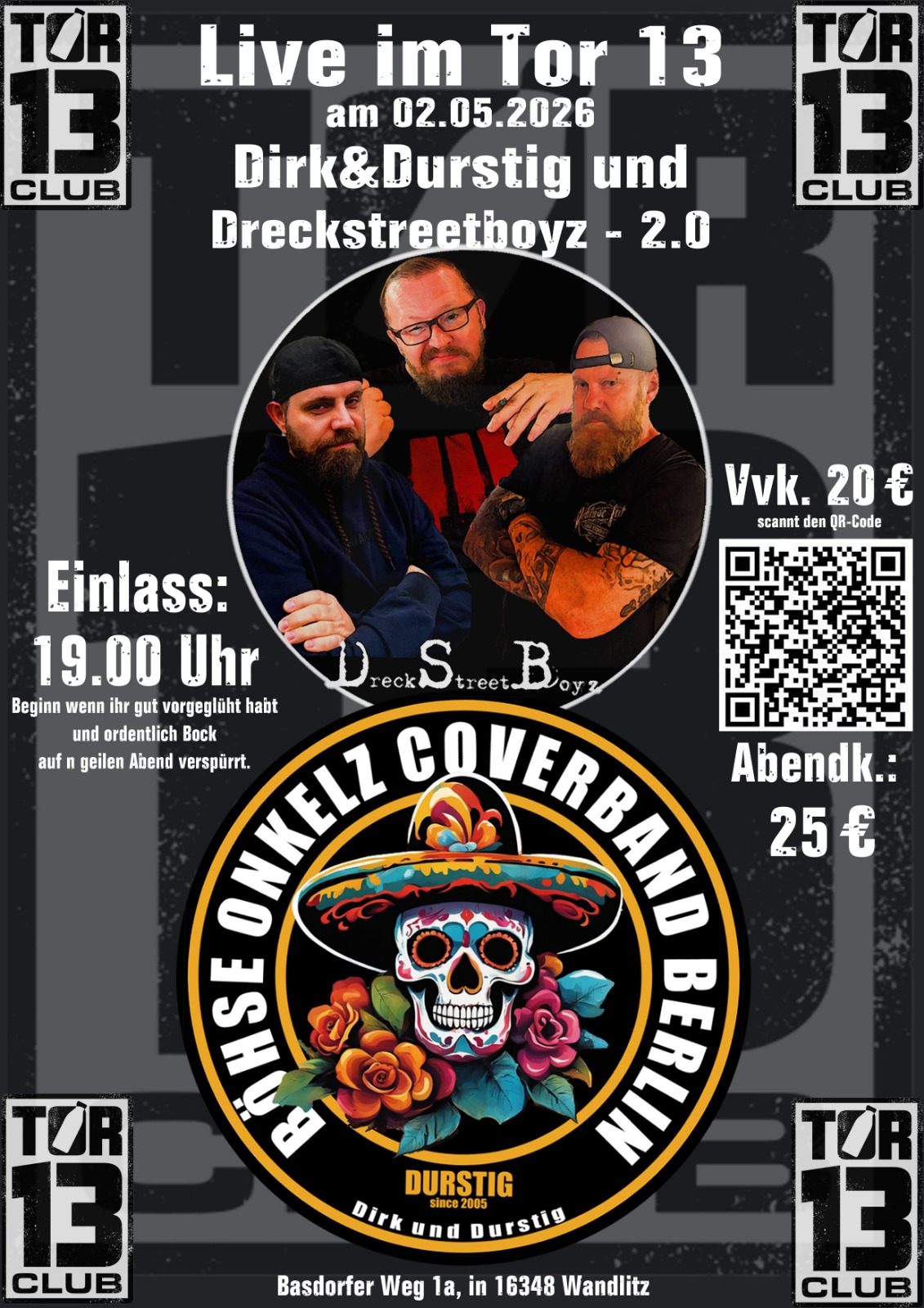 Dirk & Durstig wird wieder das TOR13 rocken! Sichert euch die begrenzten Karten unter [www.tor-13.de](http://www.tor-13.de). Ihr steht auf die Onkelz aber wollt nicht einen Kilometer von der Bühne entfernt stehen? Dann sind Dirk & Durstig genau das Richtig für euch, eine Wahnsinns Show, die unter die Haut geht und euch noch lange in den Ohren bleiben wird. Damit die Sache so richtig in Fahrt kommt, werden euch vorher die Jungs von den DreckStreetBoyz ordentlich einheizen.