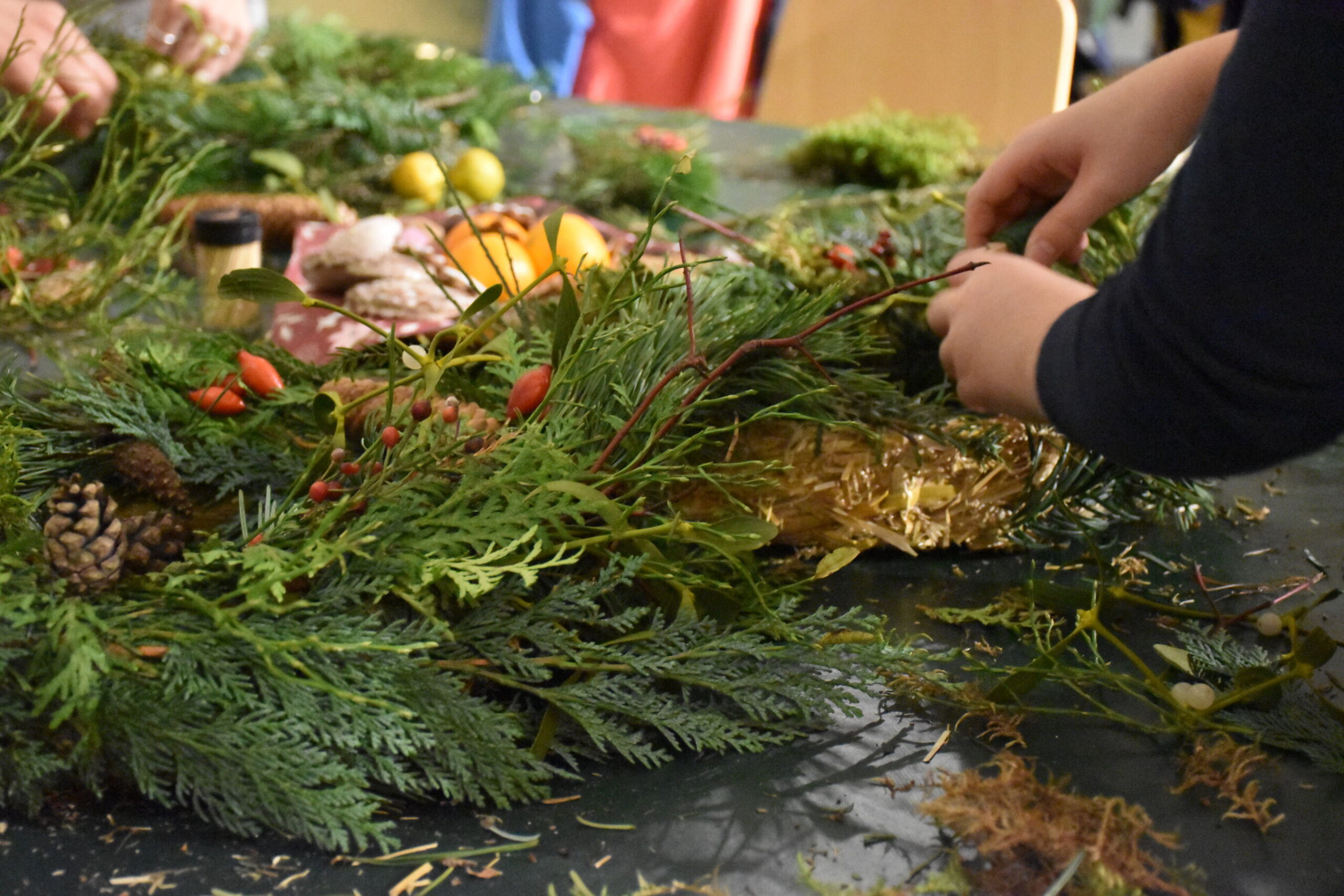 Mit Anleitung und Inspiration entsteht unter ihren Händen aus Naturmaterialien ein Kranz für die Adventszeit, den sie anschließend natürlich auch mit nach Hause nehmen können.