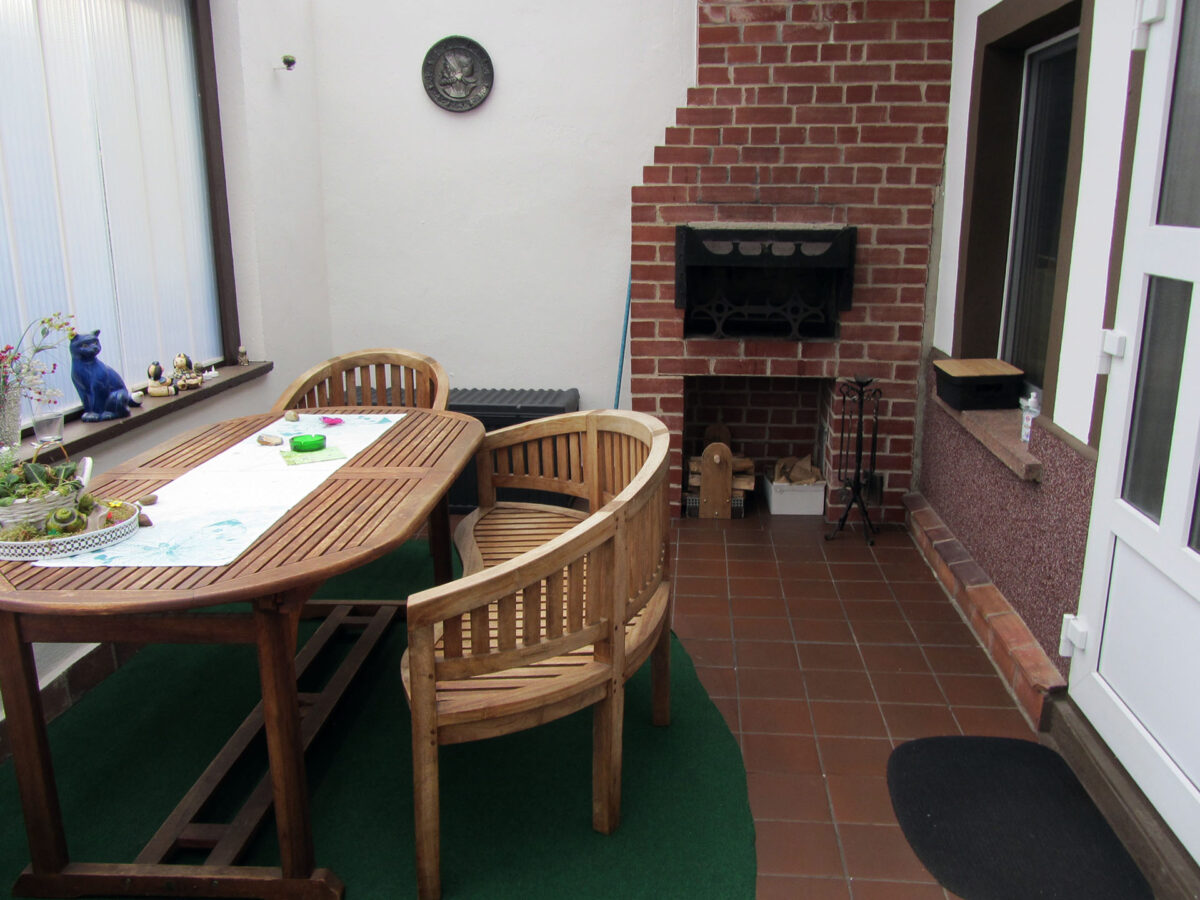 Zur Ausstattung gehört ebenso eine überdachte Terrasse mit Kamin, Grill und Gartenmöbeln sowie eine gemütliche Sitzgruppe im Garten und ein abgeschlossener Stellplatz für Ihren PKW auf dem Grundstück.